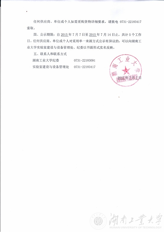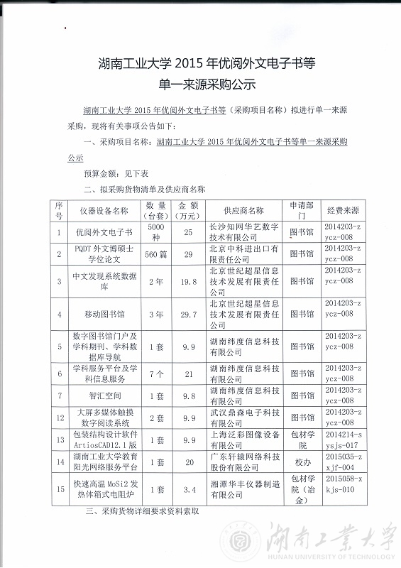湖南工业大学2015年优阅外文电子书等单一来源采购公示