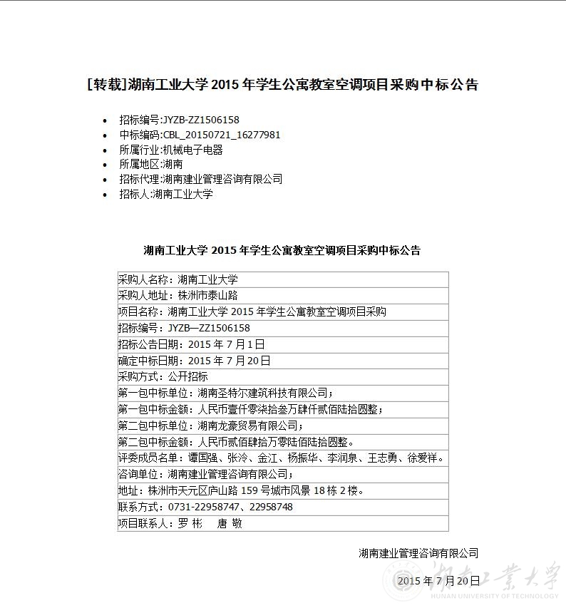 [转载]湖南工业大学2015年学生公寓教室空调项目采购中标公告