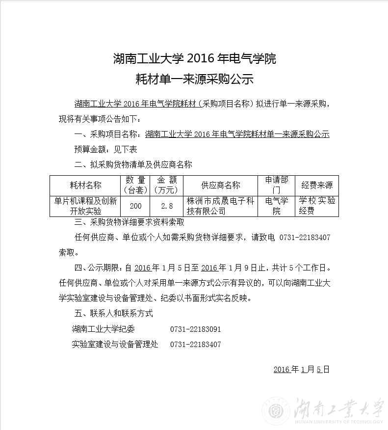 湖南工业大学2016年电气学院耗材单一来源采购公示
