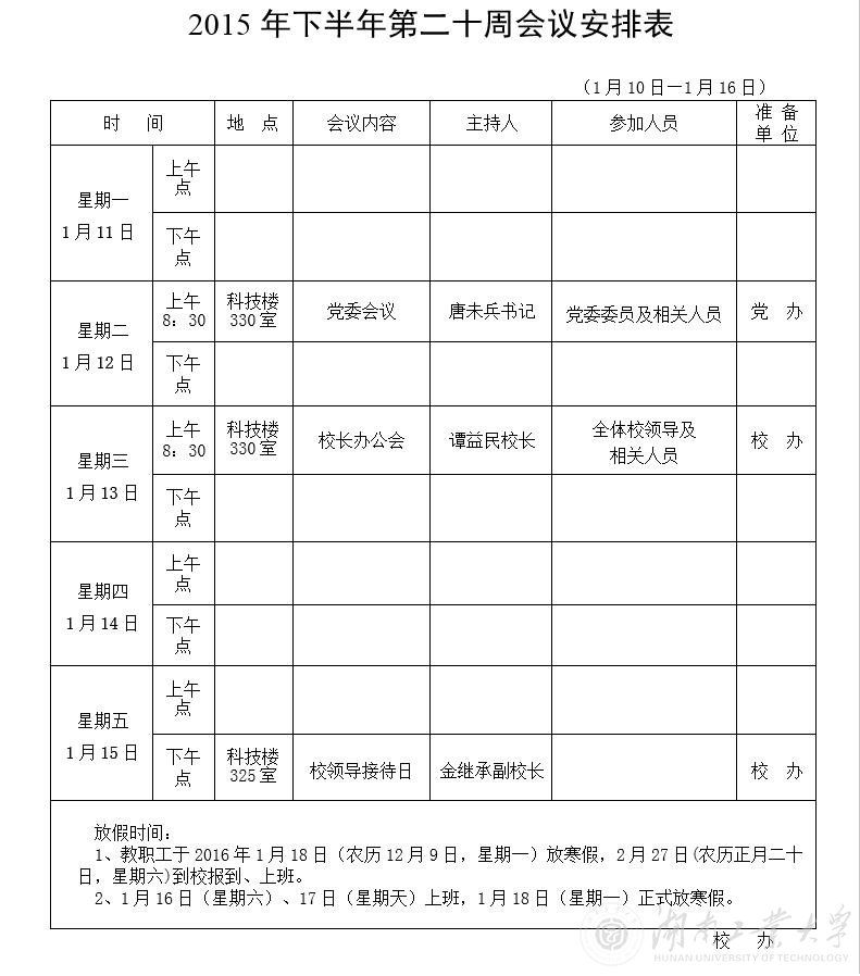 2015年下半年第二十周会议安排表