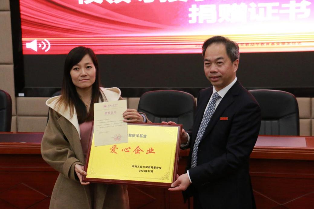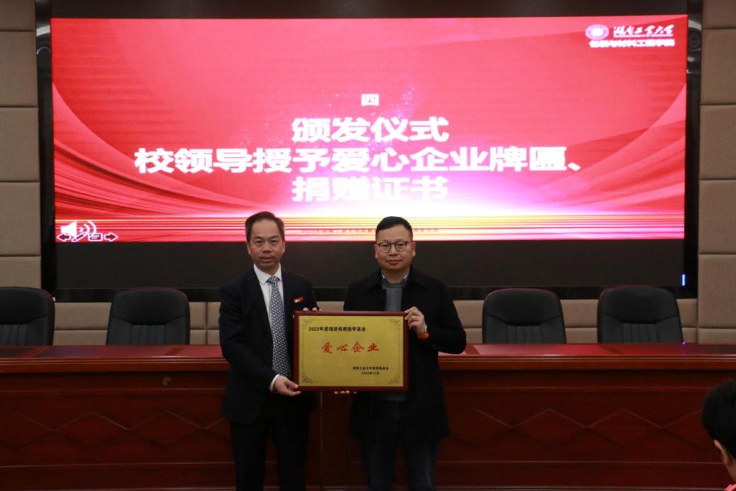 校友联络与服务中心负责人宣读“毕昇-邓景初奖学教研项目”和“大道新材助学项目”表彰决定。王利华授予爱心企业牌匾、捐赠证书。