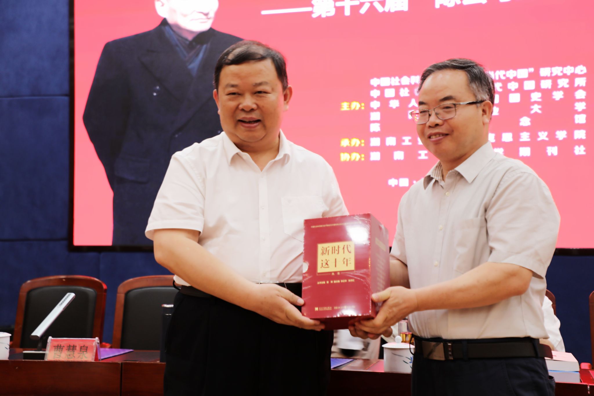 中共株洲市委书记曹慧泉代表株洲市委市政府向陈云同志次女陈伟华赠送了陶瓷画像。中国社会科学院原副院长兼当代中国研究所原所长、中华人民共和国国史学会会长、中国社会科学院“陈云与当代中国”研究中心理事长朱佳木向市委书记赠送《陈云与当代中国》(第三辑)。当代中国研究所副所长李正华向株洲市委书记、我校党委书记刘望赠送《新时代这十年》丛书。