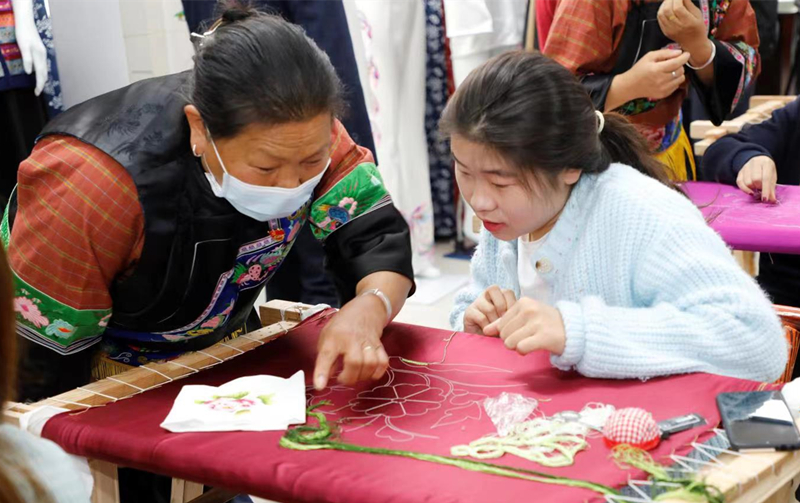 十八洞村苗绣合作社理事长石顺莲指导学生学习苗绣制作