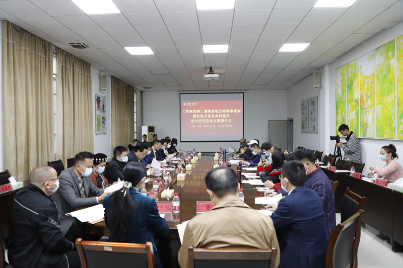 11月3日上午,湖南省地方标准《苗族刺绣》审查会暨红色文化与乡村振兴设计研究院成立授牌仪式在我校崇美楼218会议室举行。湖南省市场监管局标准化处处长王宇、湖南省民族宗教事务委员会民族教育处副处长丁亚波,校领导谭益民、蒋昌波、张亚东、李若梅、殷晓元,苗绣技术标准专家委员会全体成员出席仪式,我校相关学院和部门负责人以及部分师生代表参加仪式。