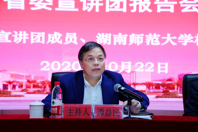 为深入学习贯彻习近平总书记考察湖南重要讲话精神(以下简称“讲话精神”),按照省委统一部署,根据省委教育工委工作安排,10月22日下午,学习贯彻习近平总书记考察湖南重要讲话精神省委宣讲团在我校音乐学院报告厅举行报告会。省委宣讲团成员、湖南师范大学校长刘起军作宣讲报告。校党委书记谭益民主持报告会。