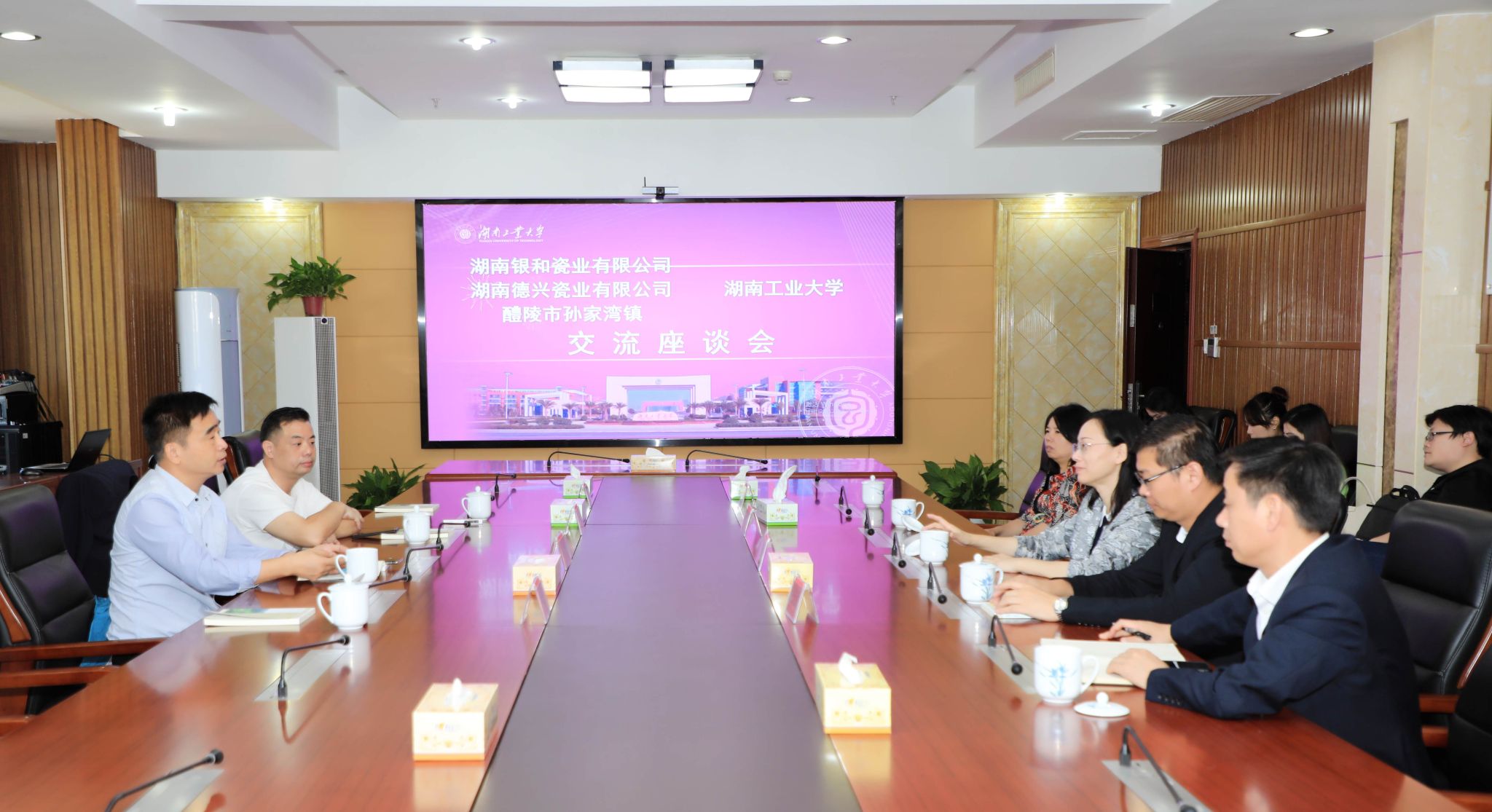 10月16日上午,湖南银和瓷业有限公司董事长肖俊彦,湖南德兴瓷业有限公司董事长童新德,醴陵市孙家湾镇书记李景兰等一行来校交流座谈。副校长李若梅出席,包装设计艺术学院、城市与环境学院、醴陵陶瓷学院相关负责人参加座谈。