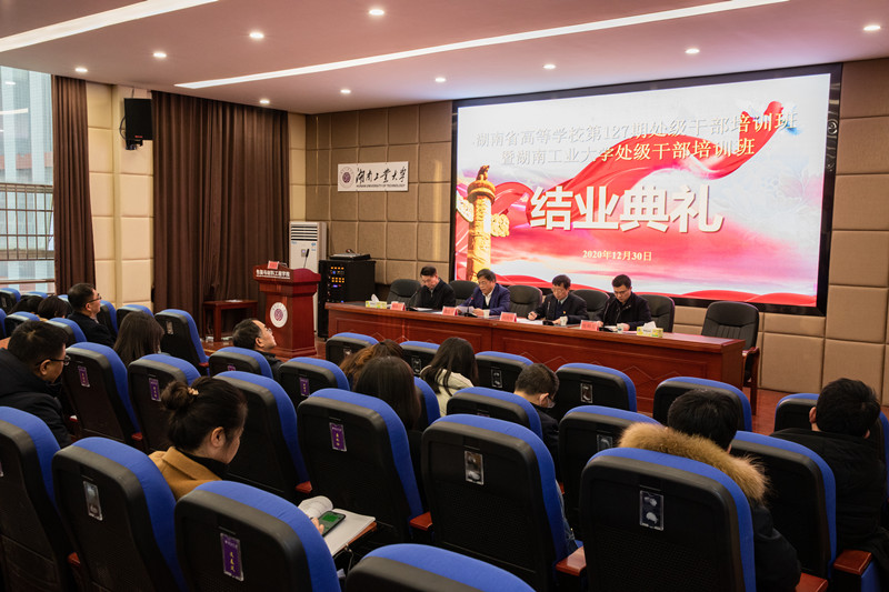12月30日下午,湖南省高等学校第127期处级干部培训班暨湖南工业大学处级干部培训班,在包材学院220报告厅举行结业典礼。党委书记谭益民致辞,党委副书记韩清波主持结业典礼并作培训班工作总结, 省委教育工委党校常务副校长、省高校干部培训中心书记、主任刘国华出席结业典礼并讲话, 省高校干部培训中心副主任张和生宣读优秀学员表彰决定,培训班全体学员参加结业典礼。