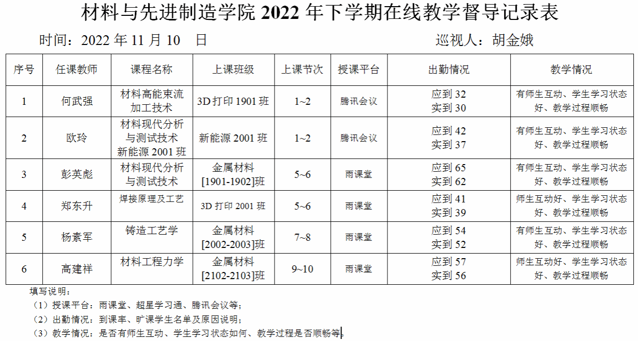 材料与先进制造学院根据学校安排,全面施行线上教学,线上教学开课率100%。为保证线上教学和线下教学同质等效,11月2日起,学院构建线上教学督导机制,优化线上教学督导指标体系,压实教师和督导双重责任,开展了形式多样、效果良好的线上教学督导活动,最大限度地降低了疫情对学院教学工作的影响。