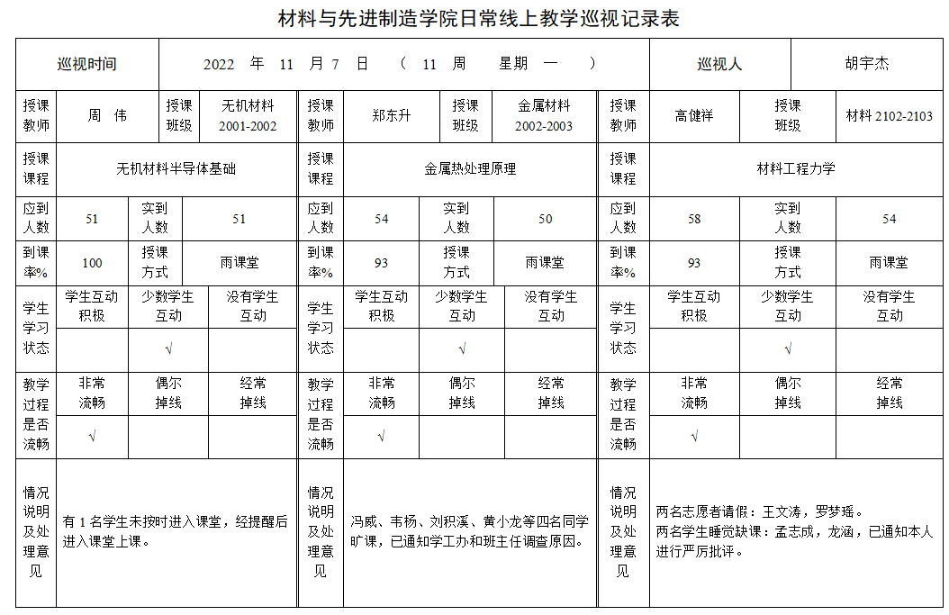 教学督导专班专项优化了线上教学督导观测指标,在教学督导过程中不仅关注教师授课内容、教学方式、教学态度和学生到课率等常规观测点,还重点关注师生互动交流、教学平台运行、学生学习状况和教师线上教学创新举措等内容。改进教学督导记录和反馈办法,精心设计线上教学巡视记录表、线上教学听课记录表,实时收集线上教学信息,及时将督导意见和建议反馈给任课教师,形成学院线上教学的“监控-反馈-改进”的闭环机制。截至目前,学院学生到课率95%以上,教师教学热情高、教学准备充分、师生互动良好。