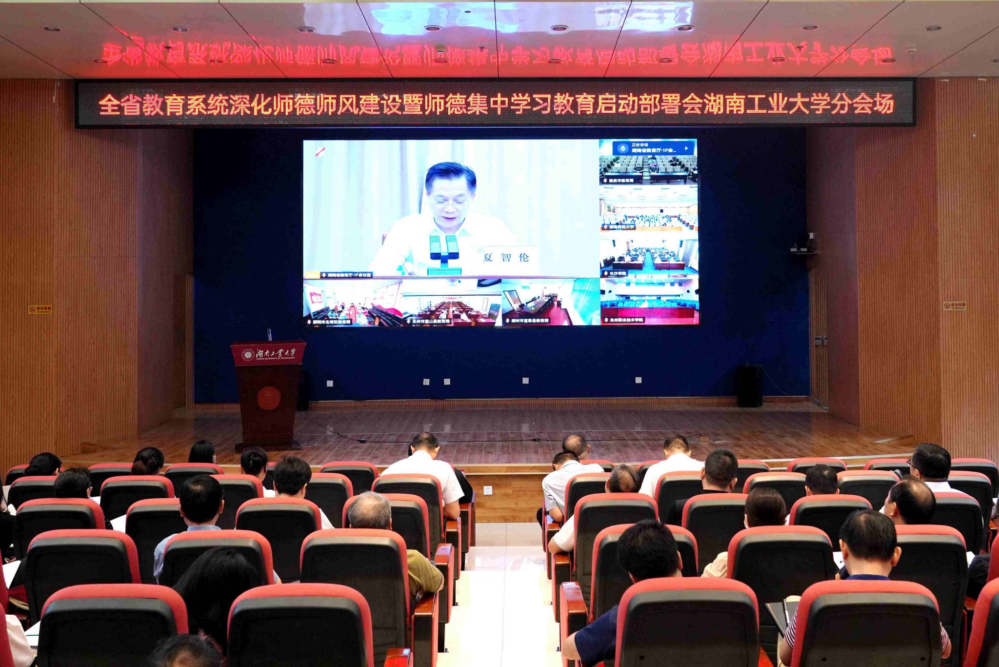 6月29日下午,省教育厅召开全省教育系统深化师德师风建设暨师德集中学习教育启动部署视频会议,我校在崇德楼报告厅设分会场。校党委书记刘望,纪委书记、湖南省监察委员会驻湖南工业大学监察专员张亚东,副校长李若梅出席。