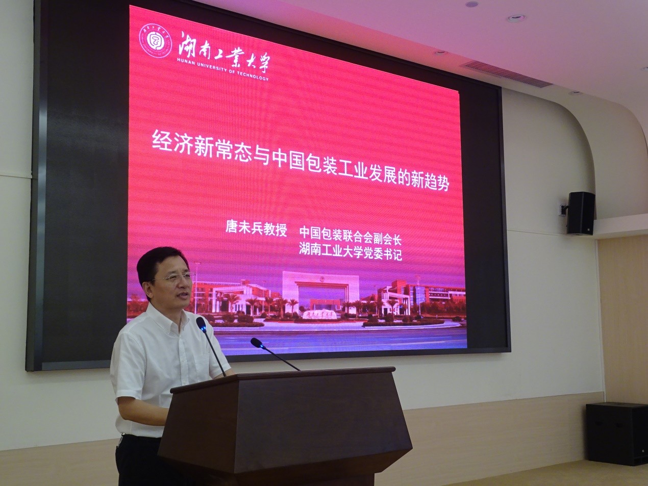 9月15日,由广东省包装技术协会、东莞市环保包装行业协会、东莞市桥头镇创新发展服务中心联合主办的2017年华南地区环保包装应用技术交流会暨第七届环保包装高峰论坛在东莞市桥头镇举行,大会吸引了200多位来自全国各地的环保包装行业专家、学者、技术骨干、企业家参加。我校党委书记唐未兵教授应邀在大会上做主题报告,他详细阐述了经济新常态、供给侧结构性改革的背景和内涵,介绍了“关于加快我国包装产业转型发展的指导意见”和“中国包装工业发展规划(2016-2020年)”的编制思路和主要内容,分析了中国包装产业发展的新趋势,与会专家和包装企业家纷纷表示:唐未兵书记的报告将对华南地区的包装界同仁调整未来发展方向、实现包装产业转型升级产生积极的影响。