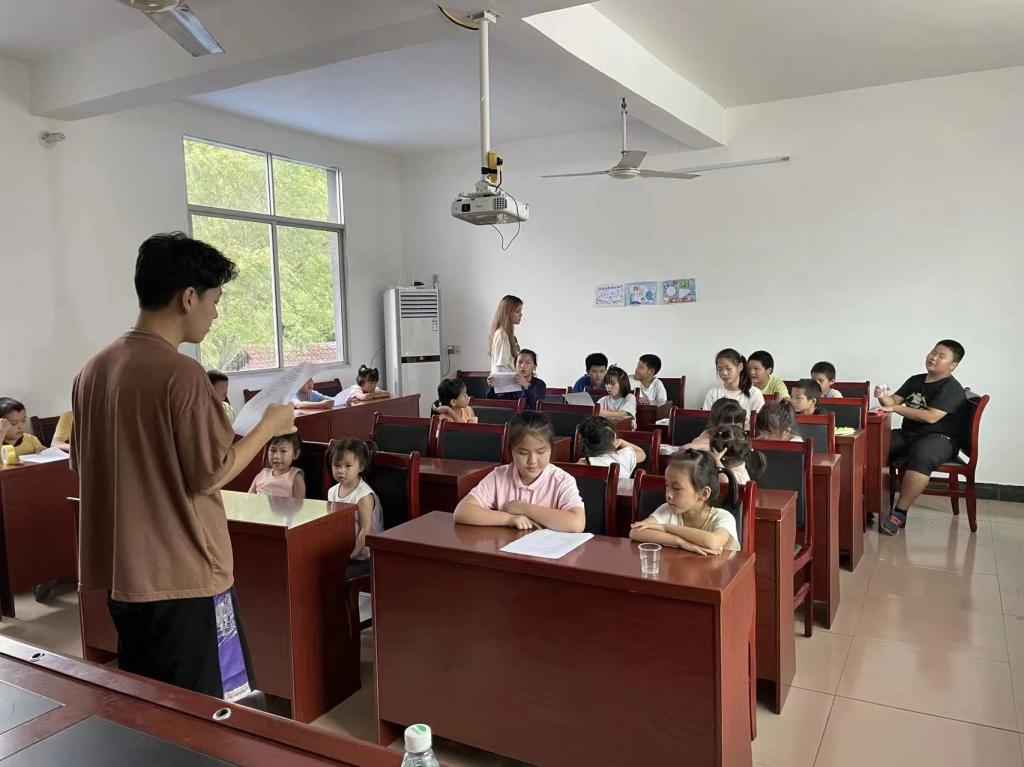 此外,夏令营还从传唱爱国歌曲、学习安全知识等多方面入手,以通俗易懂的方式进行宣讲。在红歌课堂中,队员们带领梅林村的小朋友们齐唱《我和我的祖国》,通过音乐在孩子们心中厚植爱国主义情怀。在防溺水知识课堂上,志愿者们结合绘画、剪纸等多种形式展开知识普及。其中,防溺水版的《孤勇者》受到了孩子们的一致好评。