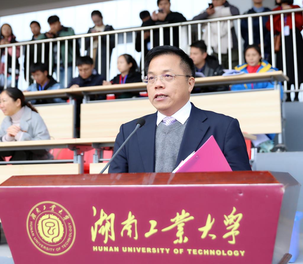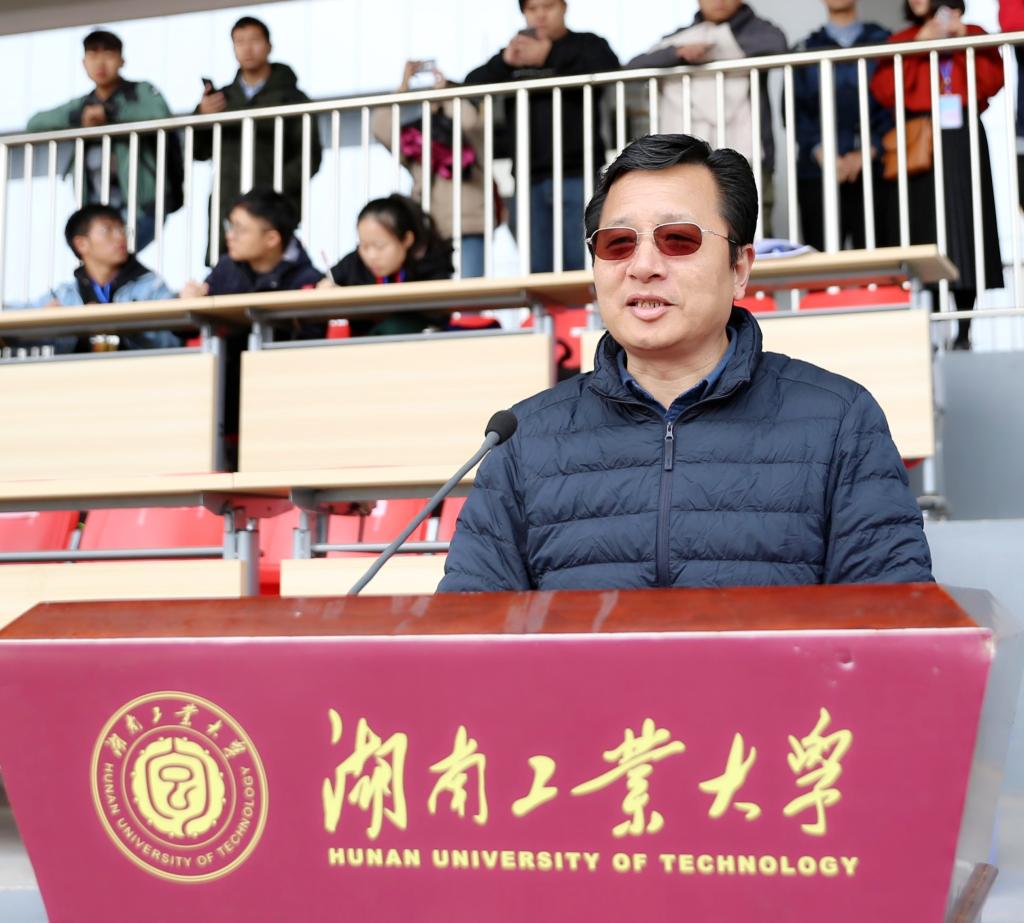 谭益民致开幕辞,他深情回顾了我校体育健儿在雅加达亚运会和湖南省第十一届大学生运动会上的精彩表现。他表示,要把大运精神贯穿到本届运动会和学校体育事业中去,采用多种方式加强校园体育文化建设,努力营造健康向上的校园体育文化氛围,引导师生员工树立科学的教育观、人才观和健康观,不断提升大学生综合体育素养。同时他希望,全体参赛运动员本着“友谊第一、比赛第二”的精神,服从大会安排,尊重裁判与对手,赛出水平,赛出风格;全体裁判工作人员本着“客观、公正、准确”的态度,严守规程,公正裁决,确保比赛工作顺利进行;全体工作人员忠于职守,热情服务,保障安全;全体观众文明观赛,遵守纪律。