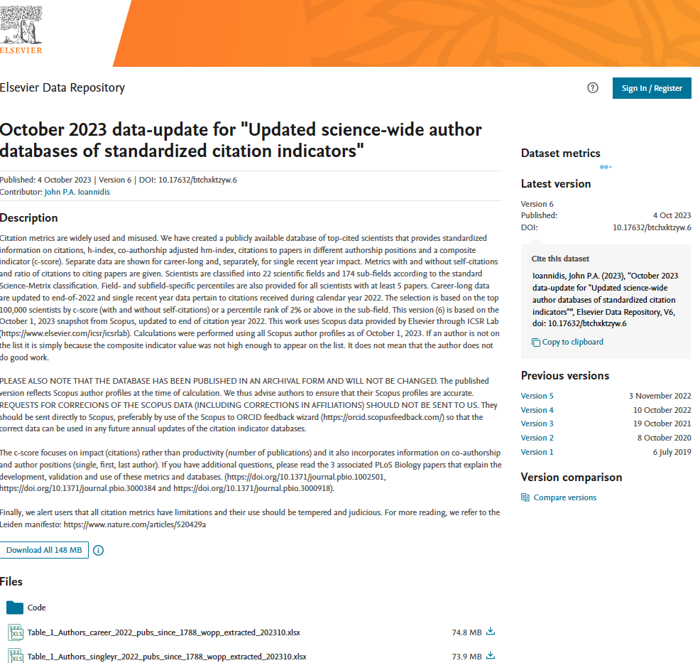 近日,美国斯坦福大学(Stanford University)和爱思唯尔数据库(Elsevier Data Repository)发布第六版 《全球前2%顶尖科学家榜单2023》 (World’s Top 2 Scientists List 2023)。