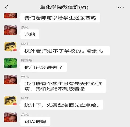 “班里有个学生患有先天性心脏病,我怕她吃不到饭着急,我们老师可以给学生送东西吗?”这是湖南工业大学生命科学与化学学院教师余礼在学院教师群里的提问。他于今年九月担任了生物技术2202班班主任,学校实行静默以来,他一直密切关注着他的学生们。
