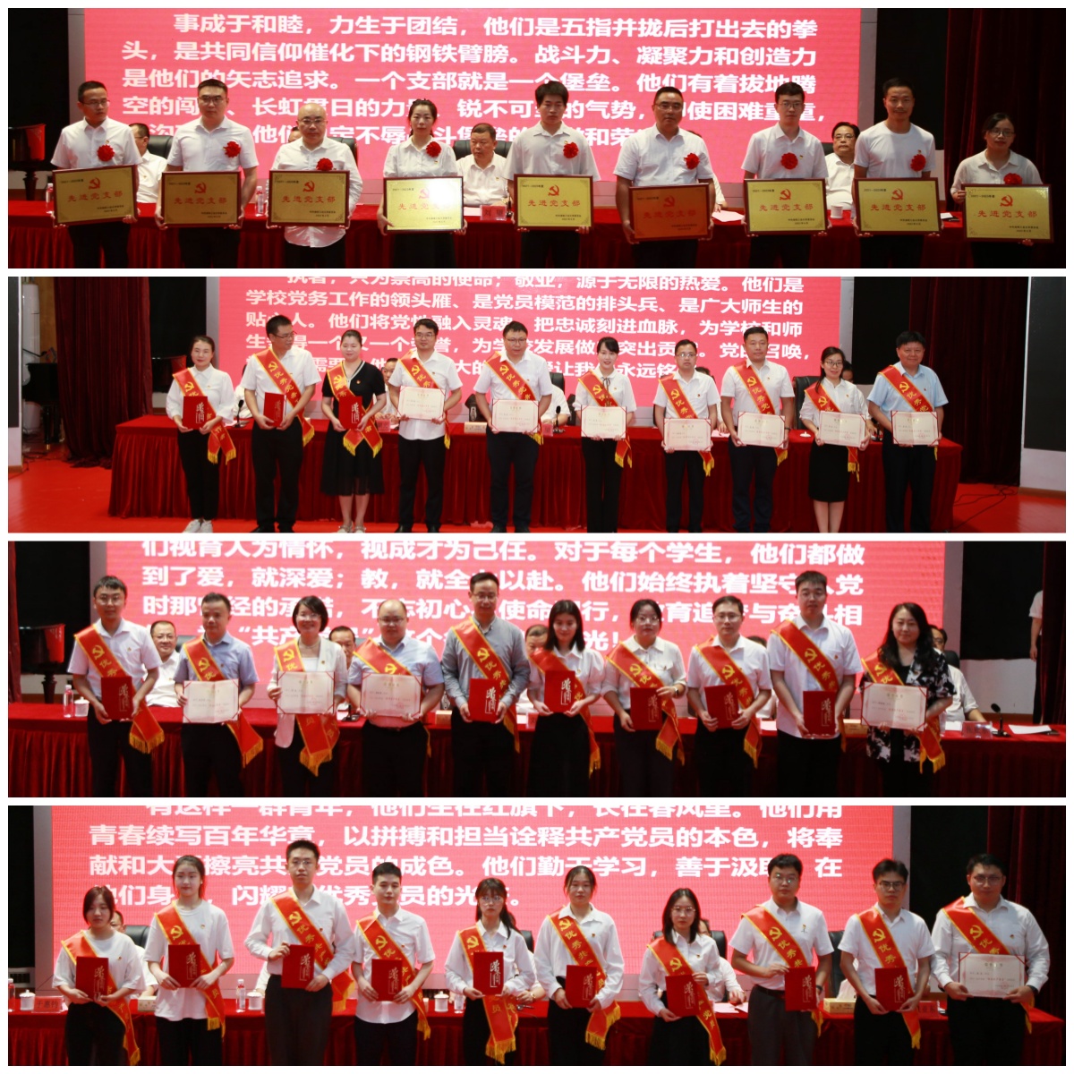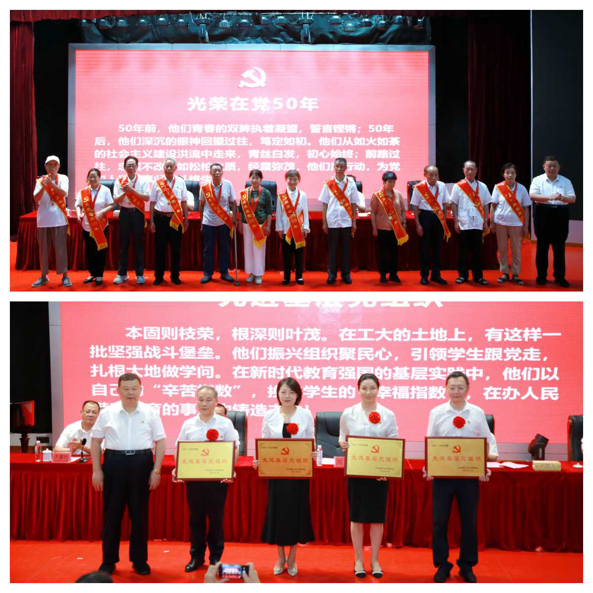 校领导分别为吴册珊等18名“光荣在党50年”纪念章获得者、刘晓林等30名优秀教工党员、孟媛等20名优秀学生党员、黄贤明等10名优秀党务工作者、轨道交通学院党委等4个先进基层党组织、材料与先进制造学院新能源材料系教师党支部等20个先进党支部颁发奖牌和奖状。