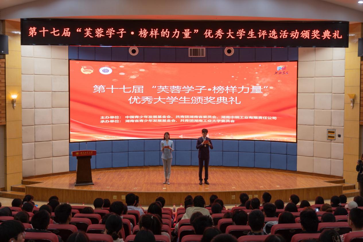 刘辉宣读了表彰决定。侯添木和向奥森获得“芙蓉学子·学术科研奖”;马欢和田万泽获得“ 芙蓉学子·道德风尚奖”; 湖南工业大学青年志愿者联合会和姜欣家获得“ 芙蓉学子·公益行动奖”;湖南工业大学教导大队和蒲秋容获得“芙蓉学子·社会实践奖”;钟帅和胡业珍获得“ 芙蓉学子·自强不息奖”。