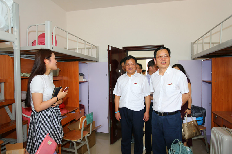 走访期间,唐未兵、谭益民在迎新中转站为2017级新生发放军训服和生活物资,并与在新生宿舍整理被单、衣物的新生和家长进行了热情交谈。