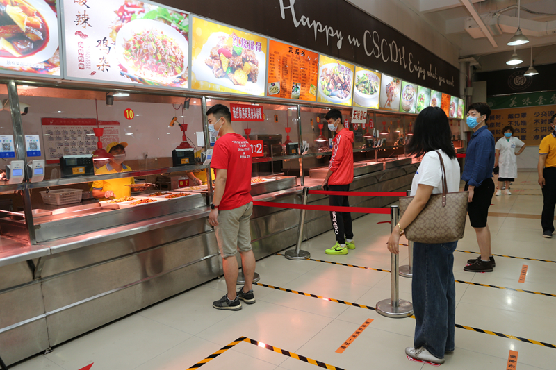 在学校五食堂,就餐学生站在黄标警戒线外,前后有效间隔1米,依次排队进入餐厅,在餐厅入口处设有洗手池、消毒液。在就餐疏导人员引导下,就餐学生前后保持1米间距排队打饭,取餐后,按照“单人单桌同向”要求就座用餐。