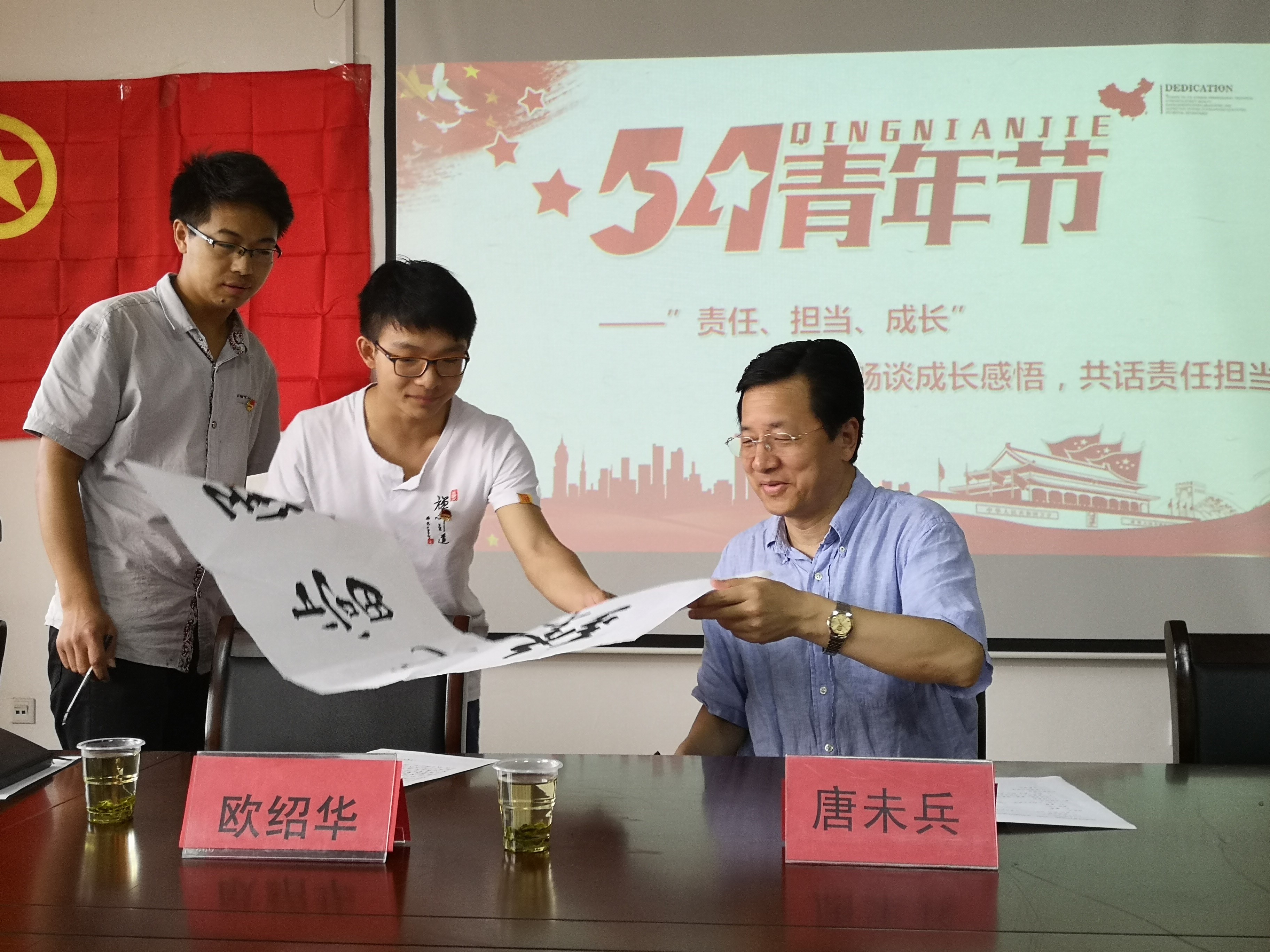 校党委书记唐未兵来到商学院和经济与贸易学院,与团员青年开展互动交流,畅聊五四精神,共话责任担当。团员们重温了入团誓词,踊跃发言分享学习习近平总书记系列重要讲话的心得体会,并结合自身实际,谈及当代大学生的成长感悟,活动中精心穿插了知识竞答、小组讨论、书法与朗诵表演等环节。曹悦是会计1604班的班长,也是2016-2017年度国家奖学金获得者,她从“自信”、“自控”、“合理规划”、“走出寝室”这四个方面与大家进行深入交流,共同探讨当代大学生如何更好地担起社会和国家的责任。