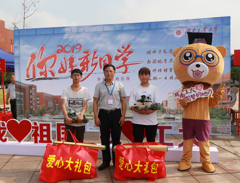 在迎新总站,校领导与辛勤忙碌在迎新工作岗位上的师生进行了热情交流,详细询问了新生报到情况。谭益民还为来自贫困地区新生送上军训服、床上用品等爱心物资。
