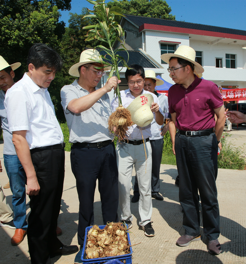 7月31日上午,我校在株洲市渌口区古岳峰镇三旺村举行“龙牙红”百合新品种现场评议及观摩会议。“龙牙红”是由我校百合种质资源创新与深加工湖南省工程研究中心和株洲市农业科学研究所共同培育出的龙牙百合新品种,为助推新品种示范推广与成果转化,我校邀请湖南农业大学校长邹学校院士、湖南农科院党委书记柏连阳教授、湖南农科院科教处处长彭选明研究员、湖南省农业生态与环境研究所朱校奇研究员、湖南省农学会薛灿辉研究员等五位专家组成专家组现场对龙牙百合新品种“龙牙红”的生物性状及产量进行现场评议。