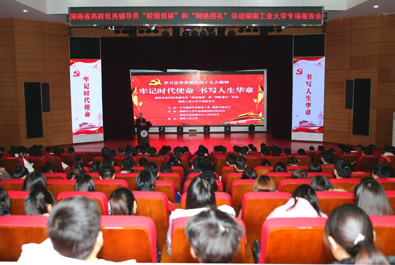 12月13日,由湖南省委教育工委、湖南省教育厅组织开展的学习宣传贯彻党的十九大精神——湖南省高校优秀辅导员“校园巡讲”和“网络巡礼”活动专场报告会在我校举行。校党委副书记韩清波,巡讲团第三组领队、长沙理工大学马克思主义学院党委书记易显飞出席,校党委组织部、宣传部、学生工作部、机关党委、校团委负责人以及各二级学院党委副书记、全体辅导员以及学生党员代表聆听了报告。