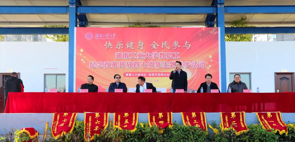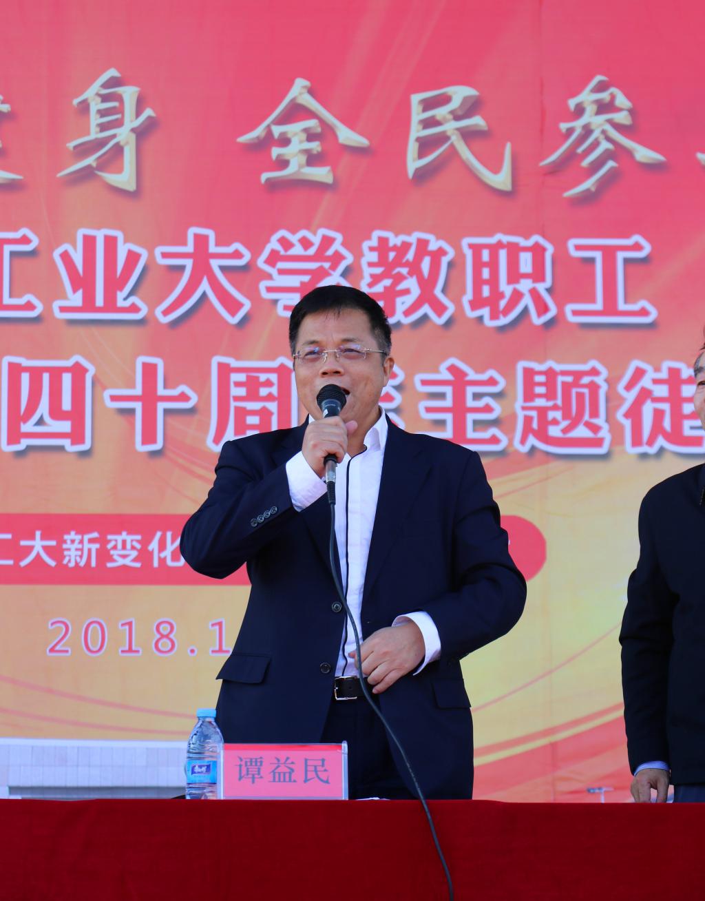 谭益民宣布纪念改革开放40周年教职工徒步比赛开幕。