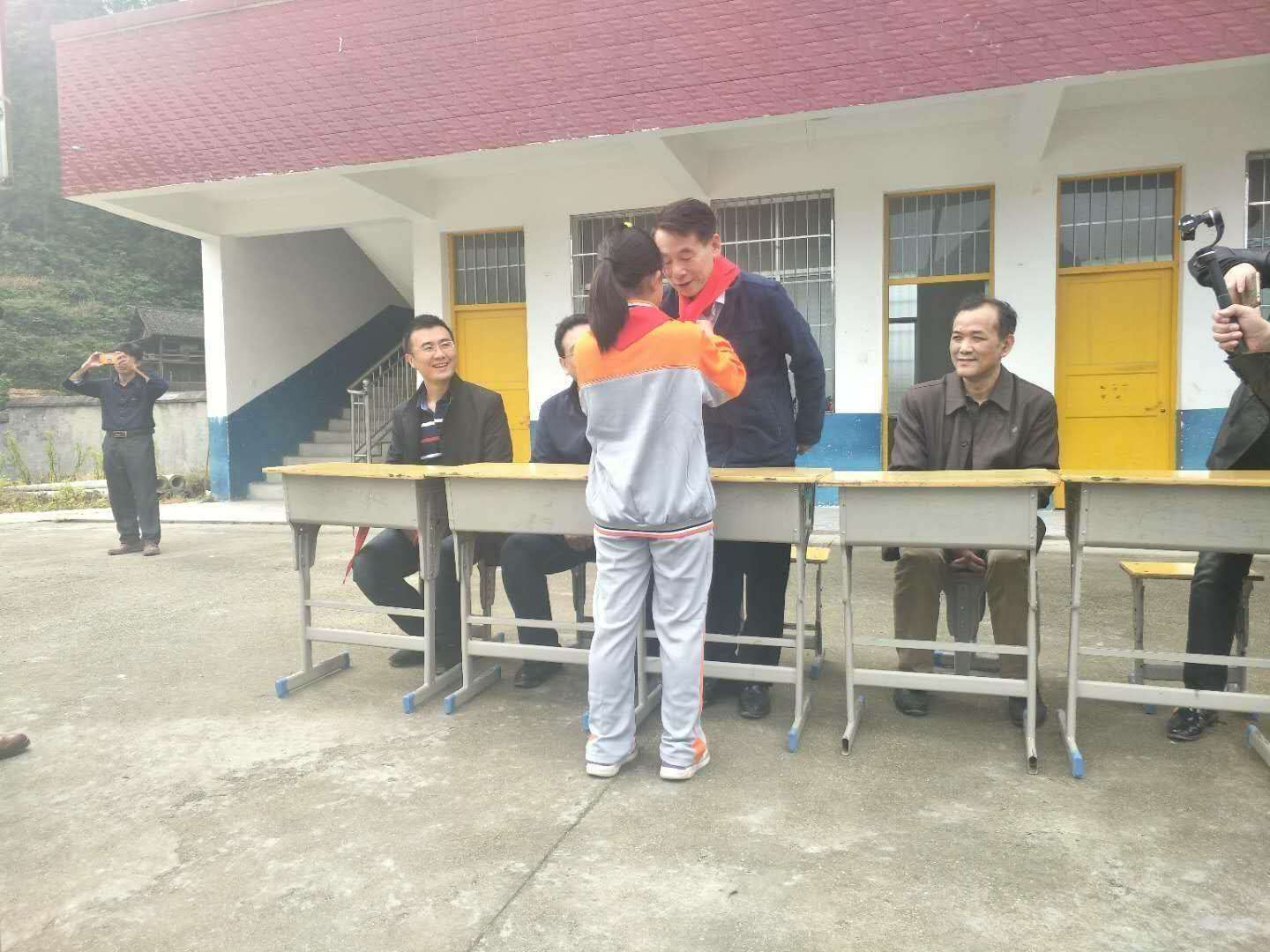 在茶园小学,我校支教学生陈阳、金宗晋带领学生合唱了迎接歌,用独特的方式表达对客人的欢迎。韩清波一行参加了校服捐赠仪式,将一套套崭新的校服送到孩子们手中,并“拉钩”的方式与他们约定,要爱祖国、爱学习、爱劳动、爱卫生、爱家人、爱自己。学生代表王周慧为韩清波献戴红领巾。
