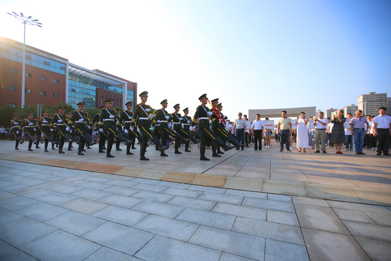 在庄严的国歌声中,在国旗护卫队的护卫下,五星红旗冉冉升起。
