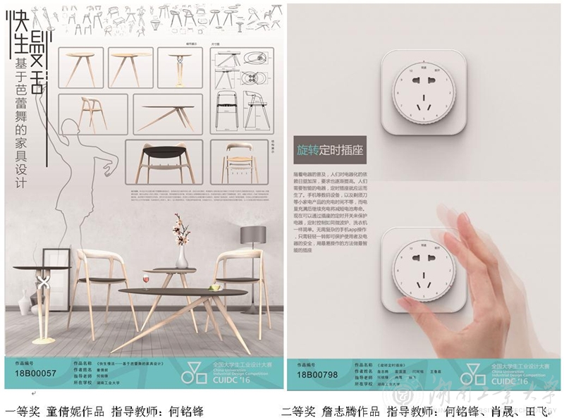 由机械工程学院何铭锋老师指导的童倩妮同学作品“快生慢活-基于芭蕾舞的家具设计”,提取芭蕾舞轻盈、灵巧、高重心的特点,将芭蕾舞姿巧妙融入家具形态语义中,给人以精致优雅的画面感。材料结合白橡与不锈钢材质,保证家具强度同时也给人温润清和的使用体验。詹志腾同学作品“旋转定时插座”,敏锐洞察到日常生活中充电时长控制的问题,用定时器与插座的巧妙结合,低技术的设计方法轻松地解决问题。”童倩妮和詹志腾同学的作品获得评委的好评,分获一、二等奖,还将制作实体模型代表湖南省赛区参加全国赛区奖项的角逐。