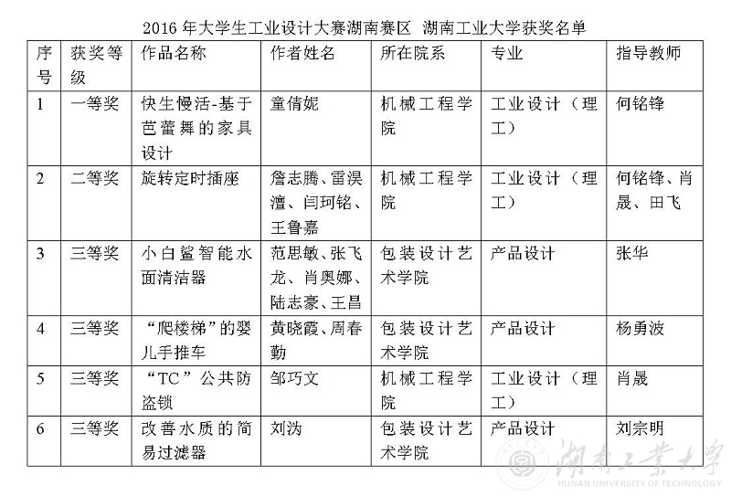2016年全国大学生工业设计大赛湖南赛区作品评审近日结束。全省共有25所设计院校参加此次竞赛,共提交作品1301件。我校6件作品在激烈的竞争中脱颖而出,共获一等奖1项,二等奖1项,三等奖4项。