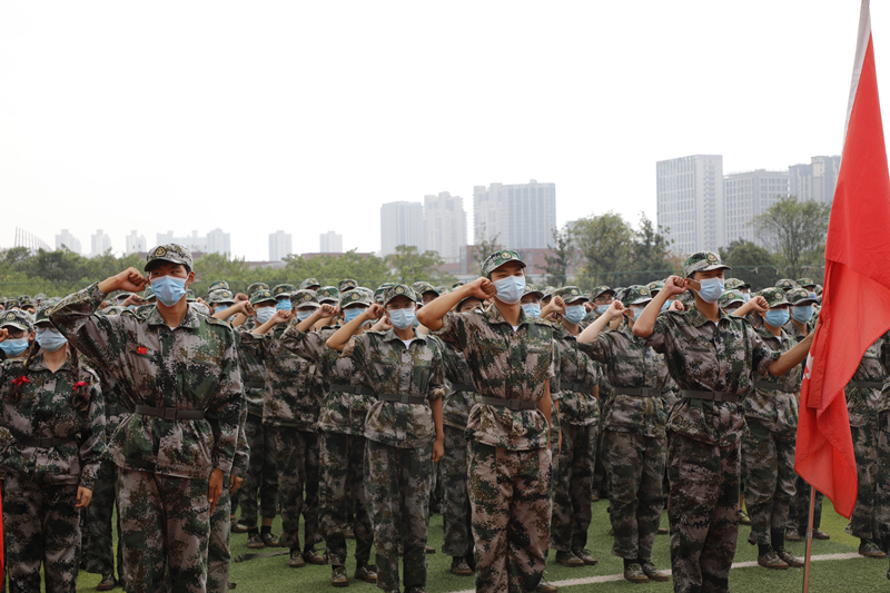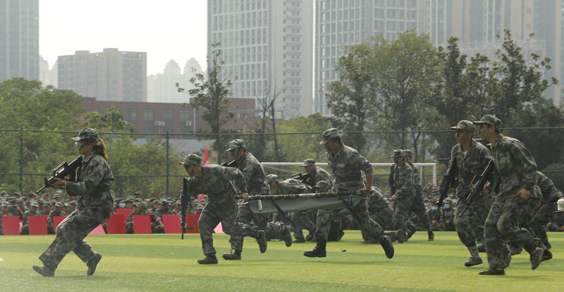 大会分为两个阶段,首先进行的是军训总结表彰大会。在军训成果汇报分列式环节,学生方队队列步履规整有力、身姿矫健高昂,在激昂豪迈的乐曲声中依次走过主席台。随后,2021级新生进行了文字方阵、扑俘拳、枪操、匕首操、战术表演和战场救护等汇报表演。