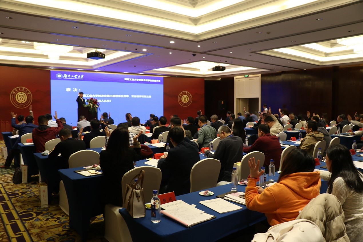 大会审议并举手表决通过第二届理事会工作报告、第二届理事会财务状况报告与《湖南工业大学校友会章程》(修订案)。校党委书记谭益民被聘为校友会第三届理事会名誉会长,校长蒋昌波当选为校友会第三届理事会会长,副校长于惠钧、北京校友会会长周志军、深圳校友会名誉会长胡德明、株洲南方阀门股份有限公司董事长黄靖、株洲校友会会长姜君、广西校友会名誉会长胡治国、长沙校友会会长潘毅、广州校友会会长曾翔、杭州校友会会长胡建军等9人当选第三届理事会副会长,校友会秘书处郭凤莲为校友会第三届理事会秘书长,经济与贸易学院何涌为第三届理事会监事长。