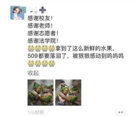 在接到爱心物资后,学院老师迅速行动,给每一位在校的同学送去暖心“甜”。学生从老师手中接过的不仅仅是水果包,更是信念与力量的传递,是大爱与感恩的传承。校友的爱心举动温暖了每一个学生的内心,学生们纷纷在网络平台上“表白”法学院校友,为校友点赞,把最真挚的感谢和敬意送给爱心校友。