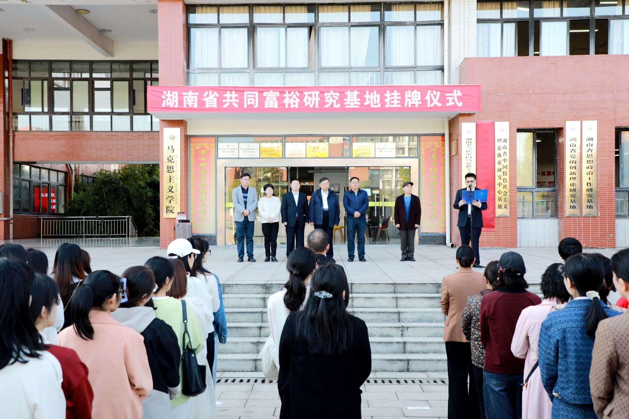 为进一步充分发挥高校的学科优势和人才优势,深入开展习近平总书记关于共同富裕的重要论述的研究、宣传和阐释,11月21日,我校举行湖南省共同富裕研究基地挂牌仪式暨“促进全体人民共同富裕”理论研讨会。校党委书记刘望,湖南省社会科学院副院长汤建军,副校长、基地负责人殷晓元,株洲市社科联党组书记罗峰出席。