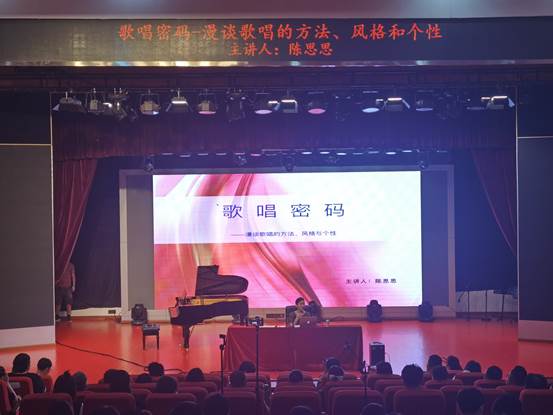 音乐学院负责人代表学校致欢迎词并介绍了陈思思教授的履历,在全院师生热烈的掌声中,陈思思以《歌唱密码——漫谈歌唱的方法、风格和个性》为题开启讲座。她从树立正确的歌唱理念、深入了解歌唱的基本形式、准确把握歌曲的体裁、充分理解歌曲的情感内容、准确把握歌曲的艺术风格等五个方面对声乐学习和歌曲演唱的要领作了全面而深刻的解析和讲解。在近两个小时讲座的过程中,陈思思与同学们适时精彩互动,现场气氛活跃、融洽,台下师生频频致以掌声。