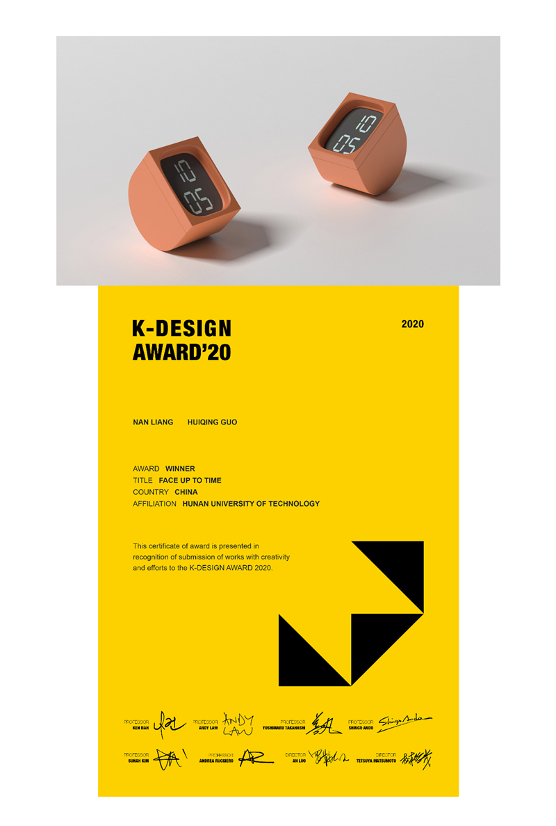 近日,机械工程学院何铭锋老师指导的学生参加国际设计竞赛再传佳绩:工业设计2016级梁男、郭慧清同学“face to time”作品获得2020年度韩国K-Design设计奖。该作品是两位同学对时间的思考系列创作作品之一,在快速应答的社会中,人们关注时间的动作短暂迅速,作者重新定义人们对于时间的关注行为,通过设计让人们重新“面对面”正视时间,表达对时间的尊重。