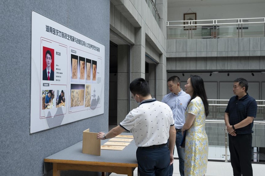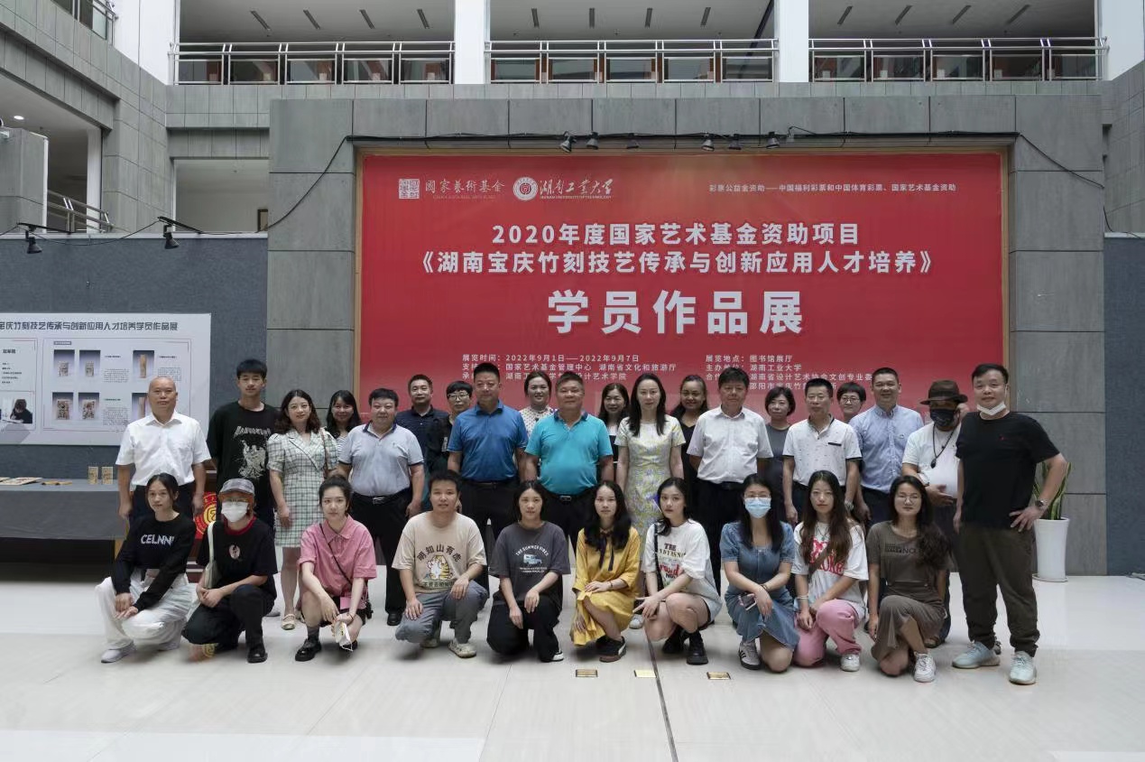近日,由国家艺术基金资助,湖南工业大学主办,湖南工业大学包装设计艺术学院承办的国家艺术基金2020年度艺术人才培养资助项目“湖南宝庆竹刻技艺传承与创新应用人才培养”学员作品展,在我校图书馆开展。项目首席专家、宝庆竹刻国家级非遗传承人张宗凡,邵阳市非遗保护传承研究所研究员谭高荣,我校副校长李若梅出席,包装设计艺术学院、社会科学处、宣传部、图书馆、教务处等部门负责人,该项目负责人、部分教师代表以及研修班学员、学生代表等参加开幕式。