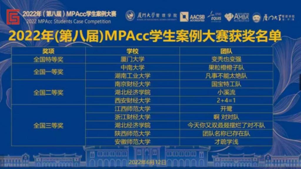 MPAcc学生案例大赛是由全国会计专业学位研究生教育指导委员会指导,MPAcc学生案例大赛组委会主办,14家培养单位联合发起组织的公益赛事。本届大赛由厦门大学承办,最终晋级决赛的11支代表队同台竞技。受全国疫情的影响,决赛全程线上进行,共分为案例PPT展示和评委提问两个环节,对参赛团队进行理论与实践的全面考核。千淘万漉虽辛苦,吹尽黄沙始到金。凡事不能太绝队的队员们以“咬定青山不放松”的韧劲、“不破楼兰终不还”的拼劲,沉下心来、扑下身子,在决赛中展现了良好的精神风貌,扎实的理论基础和突出的实践能力,创造历史,夺得辉煌!本次优异成绩的取得,是团队师生共同努力的结果,也是我校人才培养质量逐步提升、高质量特色化发展的良好展现!