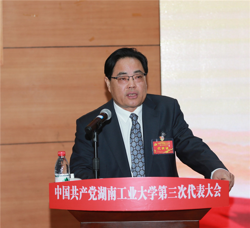 校党委书记谭益民代表中共湖南工业大学第二届委员会向大会作题为《全面落实立德树人根本任务 奋力谱写学校高质量发展新篇章》的报告。报告共分四个部分:一是过去五年的工作回顾;二是未来五年的基本方略;三是改革发展的主要任务;四是全面加强党的建设。