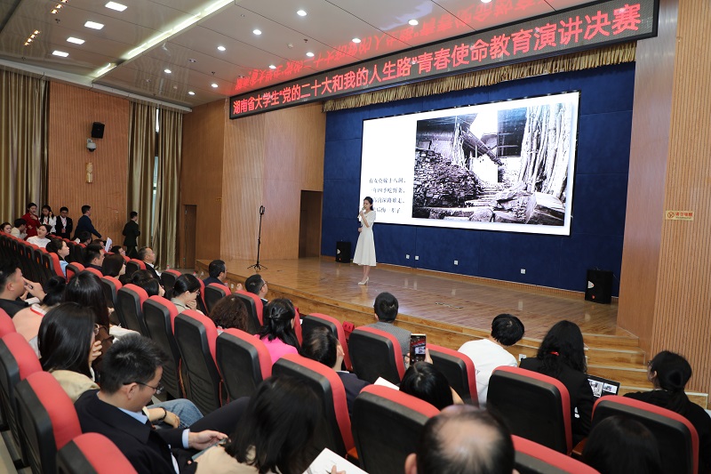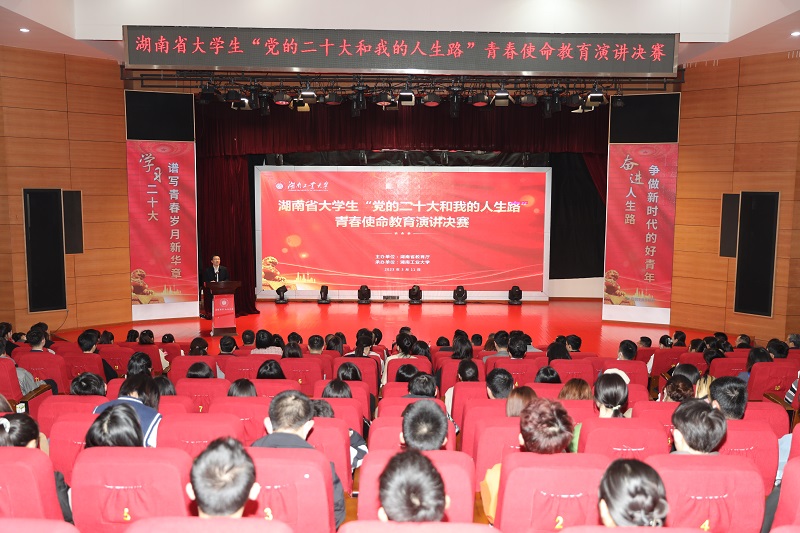在习近平总书记主持召开学校思想政治理论课教师座谈会四周年即将到来之际,在全国上下认真贯彻落实党的二十大精神之时,根据省委教育工委、省教育厅有关安排,经省内各高校组织初赛、湖南工业大学承办复赛评审选拔,3月11日上午,我校顺利举办湖南省大学生“党的二十大和我的人生路”青春使命教育演讲决赛,来自全省20余所高校的30名大学生上演振奋人心的演讲。省委教育工委宣传部部长甘文波、副部长曾思亮,我校副校长殷晓元,省内各兄弟高校领导、指导老师和参赛选手,以及学校相关职能部门负责人、前来观摩交流的兄弟高校师生代表出席开幕式。