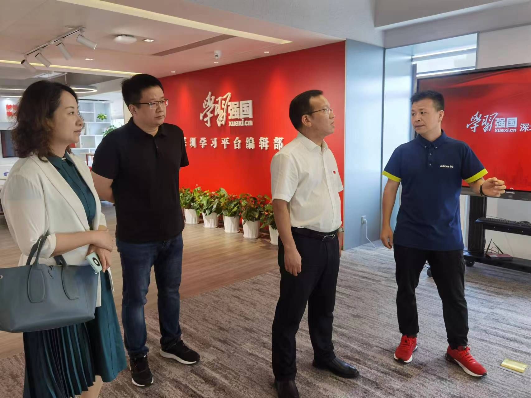 在深圳报业集团,90级文秘专业校友、副总编辑陈迅热情接待了佘朝文一行,并陪同参观了新媒体大楼、学习强国深圳平台编辑部、全媒体指挥中心等场地。佘朝文与深圳报业集团社长丁时照进行了亲切会谈,丁时照社长对佘朝文一行到来表示热烈欢迎,他对集团的发展历程做了介绍,并希望今后能与学校加强联系,深化合作。佘朝文介绍了我校的基本情况和人才培养优势及特色。双方就校企合作、人才培养、毕业生实习就业等内容进行了深入交流并达成合作意向并签署合作协议。