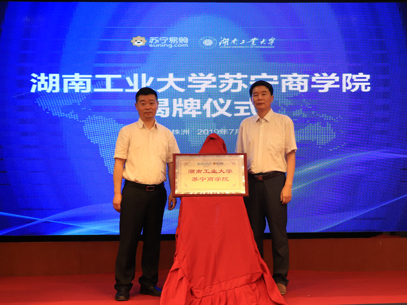 7月26日上午,我校与苏宁易购合作共建的湖南工业大学苏宁商学院揭牌仪式在华天大酒店五楼华天厅举行。株洲市人大常委会党组书记、常务副主任刘光跃、我校党委委员、副校长张昌凡,湖南苏宁易购有限公司总经理窦祝平出席仪式。