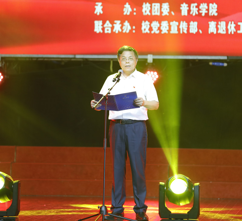 谭益民致辞。他指出,100年来中国共产党团结带领全国各族人民,创造了一个又一个彪炳史册的人间奇迹,实现了从站起来到富起来再到强起来的伟大飞跃。在党的坚强领导下,学校坚持守正创新强内涵,凝心聚力谋发展,各项事业实现了新时代新跨越。他强调,在“两个一百年”奋斗目标交汇的历史关键时期,我们要始终坚持以习近平新时代中国特色社会主义思想为指导,不忘初心、牢记使命,深化党史学习教育,从百年党史中赓续红色血脉,汲取砥砺奋进的精神力量,切实做到“学史明理、学史增信、学史崇德、学史力行”。