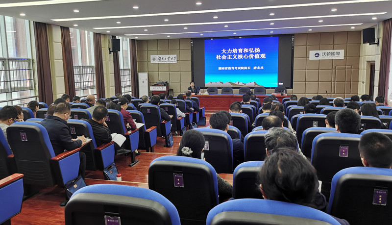 11月19日下午,湖南省教育考试院院长唐未兵教授应邀来校,以“大力培育和弘扬社会主义核心价值观”为题,为湖南省高校第127期处级干部培训班暨湖南工业大学处级干部培训班学员授课。副校长李可兴主持授课活动。