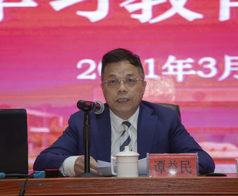就如何扎实开展党史学习教育,谭益民提出四点要求:一要提高站位,统一思想;二要精心组织,全员学习;三要加强领导,强化宣传;四要统筹谋划,抓好实践。他强调,学校各级党组织、党员干部要深入学习领会,提高政治站位,切实把思想和行动统一到习近平总书记重要讲话精神和党中央决策部署上来,紧紧围绕学懂弄通做实党的创新理论,坚持学习党史与学习新中国史、改革开放史、社会主义发展史相贯通,牢牢把握学史明理、学史增信、学史崇德、学史力行的目标要求,不断增强“四个意识”、坚定“四个自信”、做到“两个维护”,不断提升政治判断力、政治领悟力、政治执行力。要坚持领导带头抓责任落实,以“关键少数”带动“绝大多数”,以点带面、层层推进,迅速掀起党史学习教育热潮;要加强宣传,在校园形成学习宣传党史学习教育的浓厚氛围;要加强统筹谋划,务实抓好“我为群众办实事”实践活动,开展“领导干部结对帮扶师生”“学生党员亮身份带学风”“文明校园 你我共创”等系列活动,帮助师生解决贫困学困等实际困难,让师生感受到学习教育带来的新变化、新气象。要高度重视、主动谋划、积极行动,聚焦新发展阶段、新发展理念、新发展格局和高质量发展的内涵要求、逻辑关系,聚焦学校第三次党代会确定的发展目标,聚焦实施“三高四新”战略,在学党史、悟思想、办实事、开新局上下功夫,真正做到学有所获、学有所悟、学有所成,把学习成效转化为推动学校高质量发展的新动力,奋力开创学校高质量发展的新局面,确保学校“十四五”开局迈好第一步、见到新气象,以优异的成绩庆祝中国共产党成立一百周年!