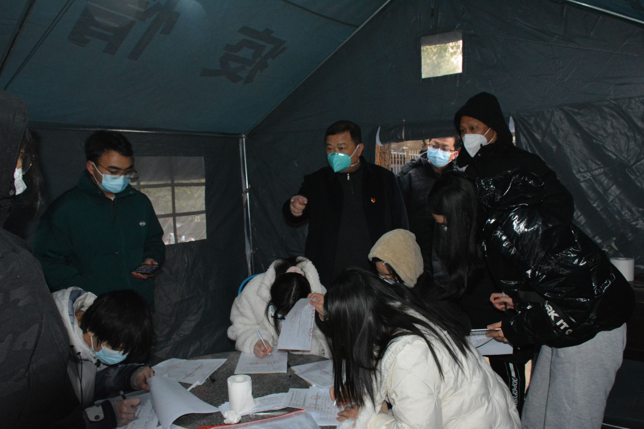 看望在帐篷里为学生服务的职工