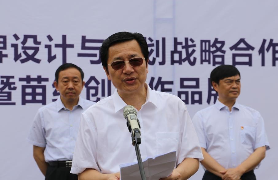 罗明致欢迎词,他代表花垣县委县政府,向各位领导、嘉宾的到来表示热烈欢迎,他深情回顾了我校与十八洞村苗绣的对接帮扶过程,感谢学校对苗族非遗保护传承的帮助,并表示将一如既往地为师生提供教学和社会实践的条件,以“绣色十八洞”苗绣设计与创新基地为载体,加大校企合作力度,共同培养具有工匠精神的新时代创新型人才。