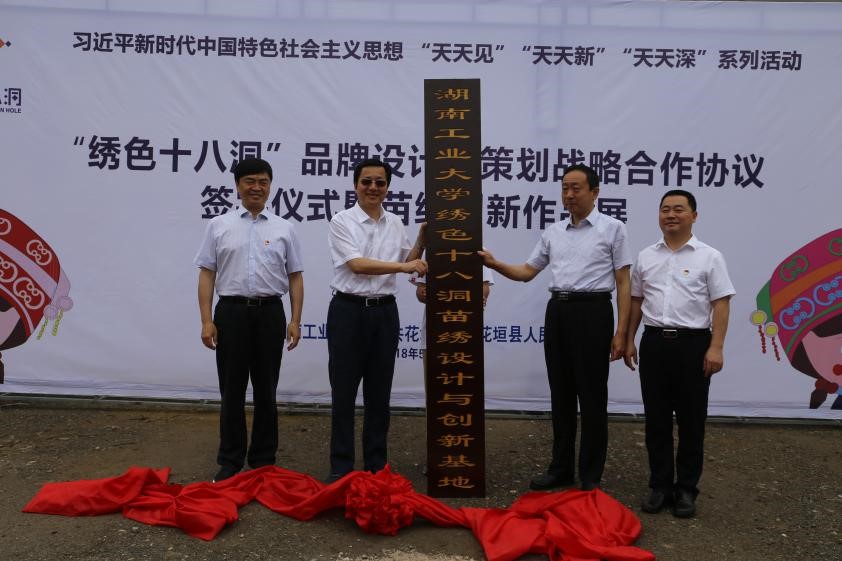 为积极响应习近平总书记号召,兑现我校包装设计学科优势精准帮扶十八洞村苗绣产品开发承诺,5月21日上午,我校在花垣县十八洞村举行了“绣色十八洞”品牌设计与策划战略合作协议签字仪式暨苗绣创新作品展,充分利用学校包装教育特色,组织攻关团队成立“绣色十八洞”苗绣创新基地,帮助苗绣走出大山,走进市场,走进千家万户。